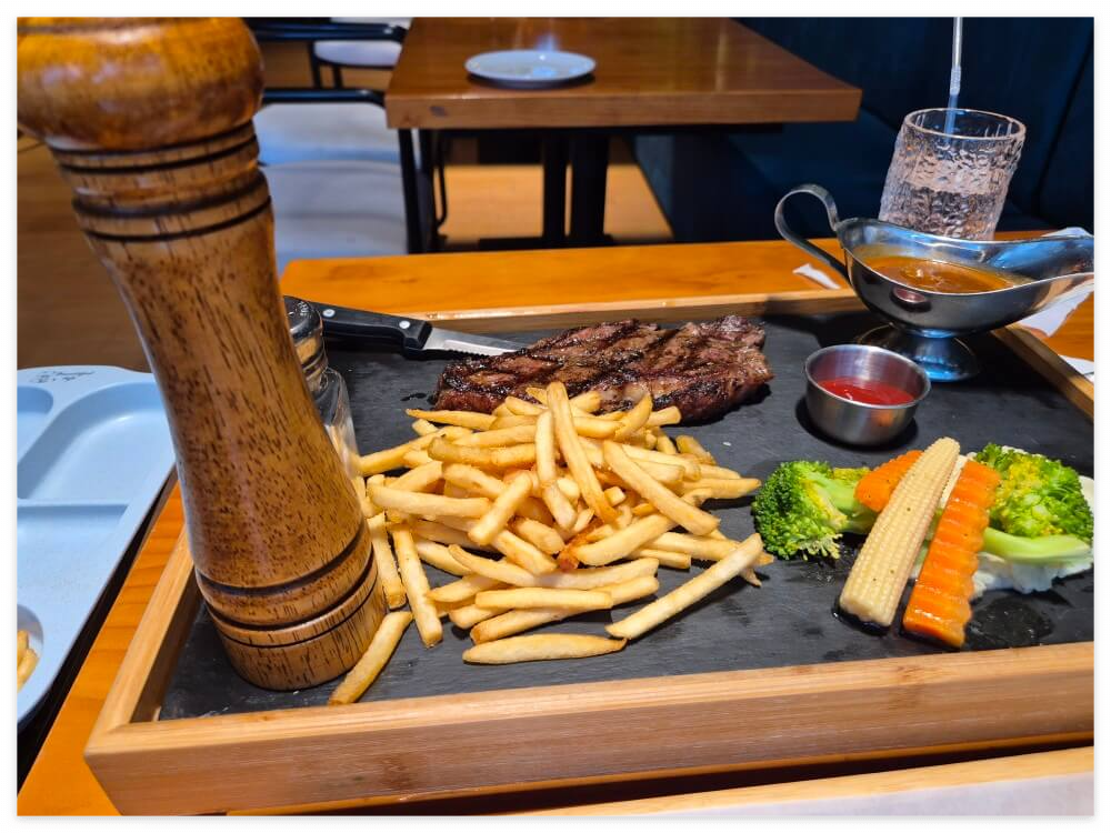 스테이크는 주문 시 굽기 정도에 따라 평가가 엇갈렸다. 웰던 혹은 미디움 웰던으로 조리했을 경우 육즙이 빠져 다소 퍽퍽하였고, 고기 자체가 질기게 느껴지는 부분도 있었다. 반면 미디움으로 주문한다면 보다 부드럽고 풍미 있는 맛을 기대할 수 있을 것이다. 따라서 스테이크는 주문 방식에 따라 만족도가 크게 달라질 수 있는 메뉴였다.