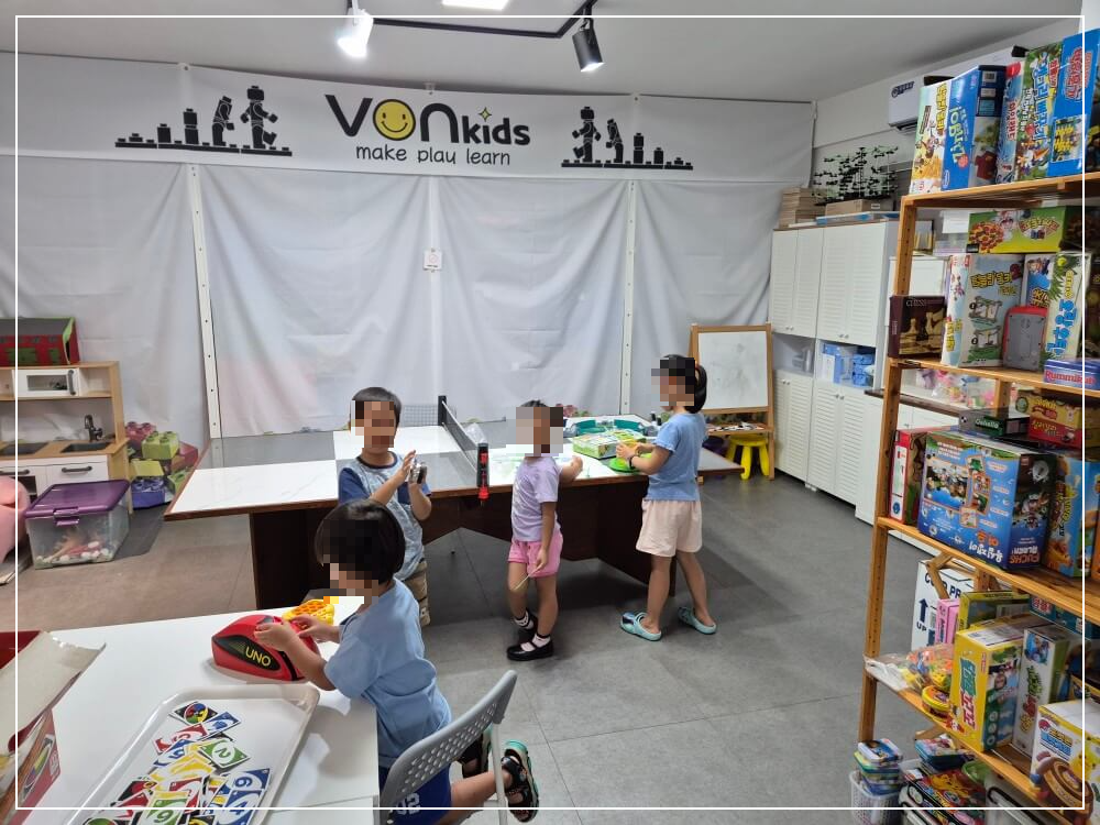Von Kids Saipan은 아이들이 즐겁게 시간을 보낼 수 있도록 보드게임, 블록 놀이, 미술 활동, 슬라임 체험 등 다양한 실내 프로그램을 갖추고 있다. 현지 직원들과의 자연스러운 소통을 통해 영어 노출이 가능하며, 학습을 위한 억지스러운 교육이 아닌 놀이 속 학습이라는 장점을 지닌다.